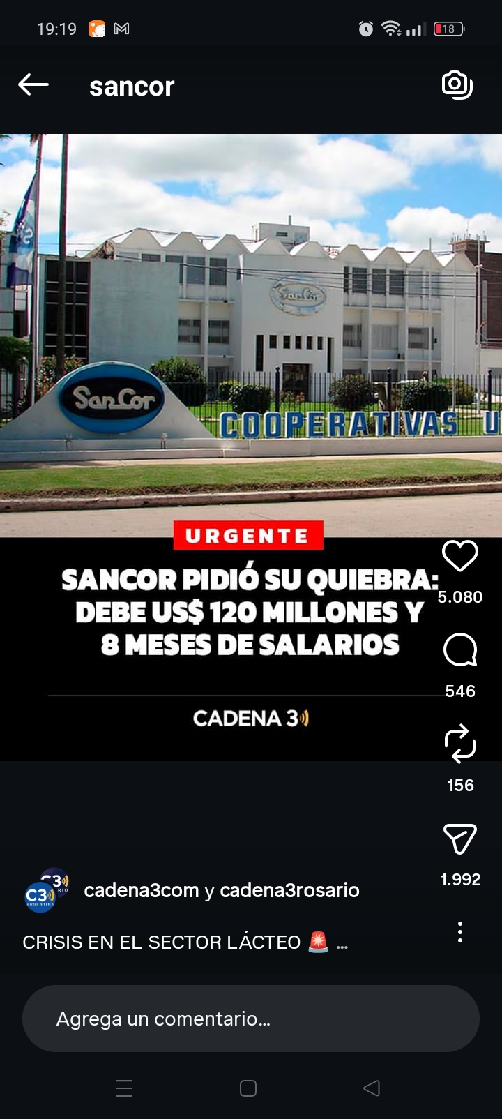 Tal como se dio a conocer esta semana la historica empresa Sancor pidió si quiebra por una deuda de 120 millones de dólares y adeuda 8 meses de salarios.